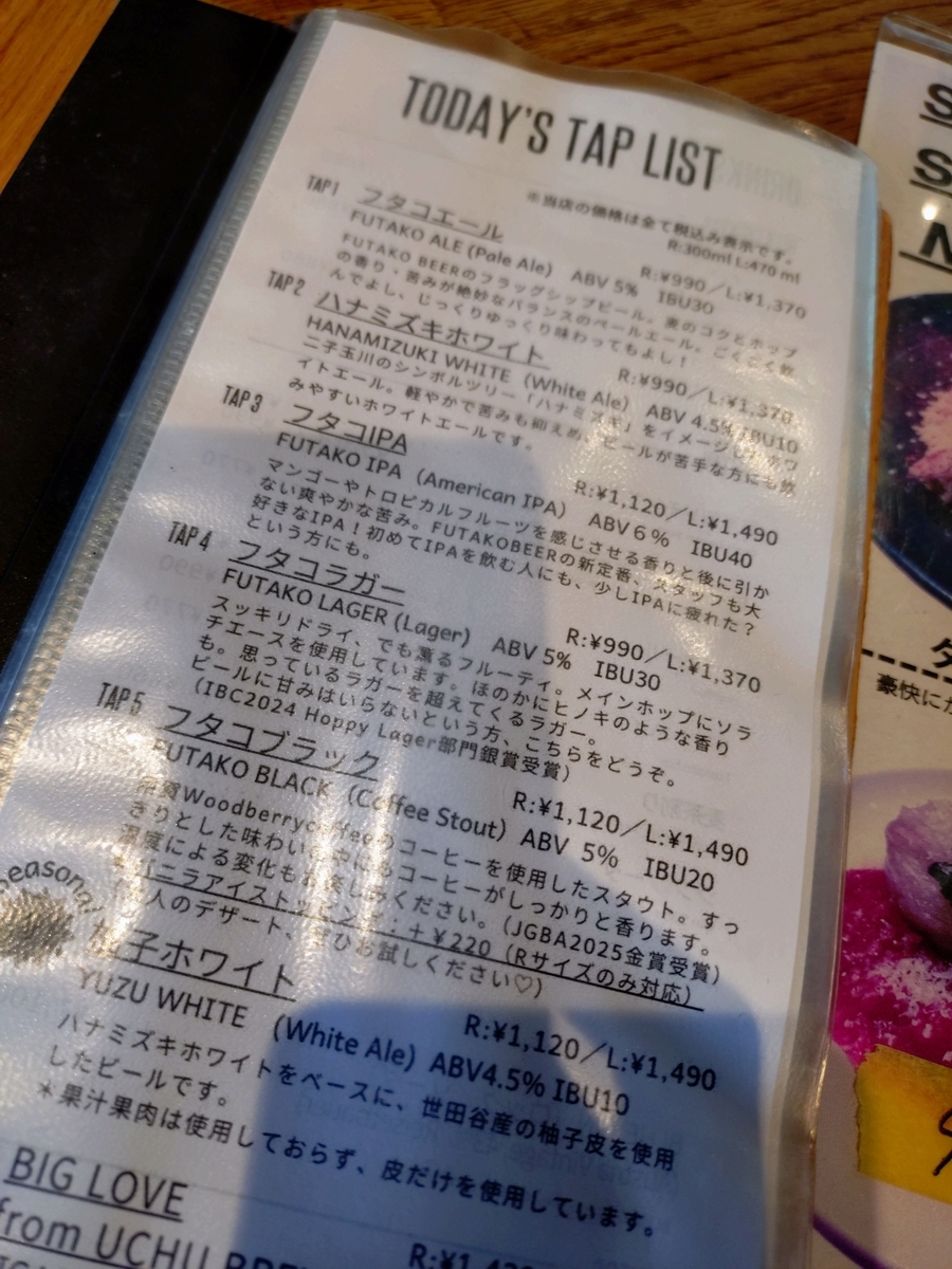 旦那さんはふたこIPAを注文。二子玉川の花「ハナミズキ」の名前がついたビールなんてのもあって、ちょっとロマンチック🌸